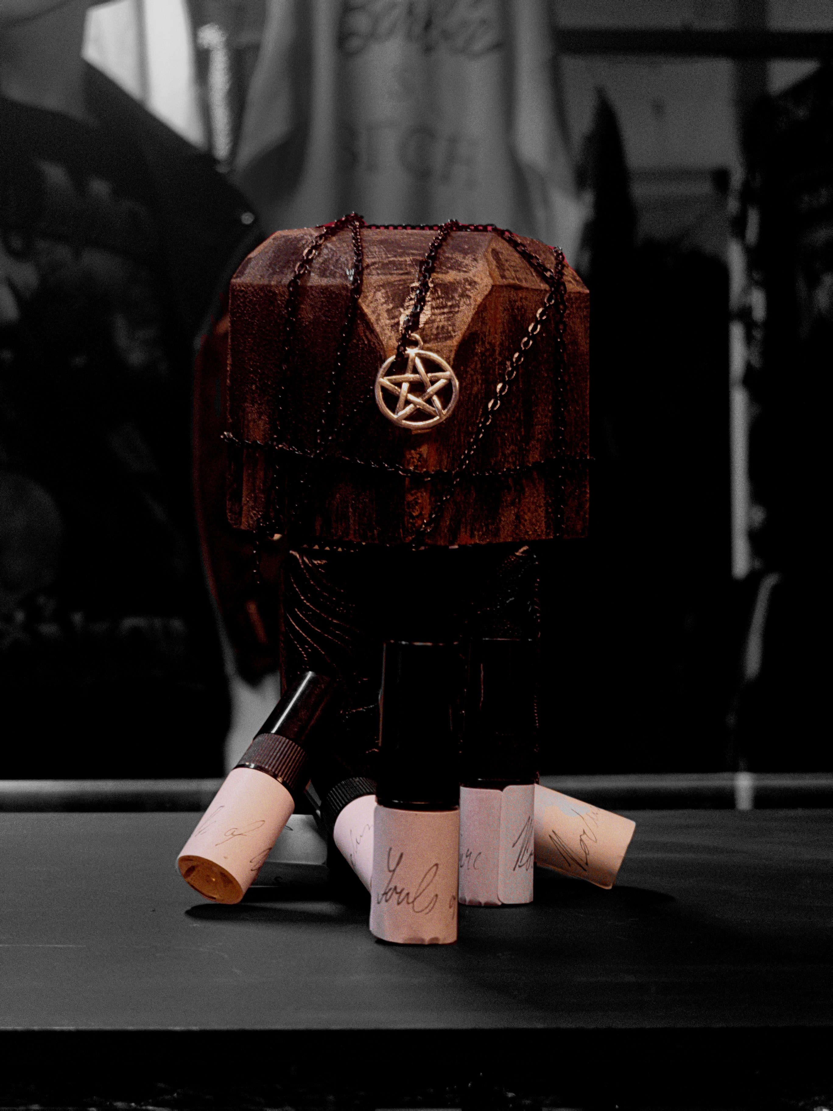 Každý flakón je ručne vyrobený zo samotvrdnúcej hliny, tvarovaný jednotlivo a zámerne ponechaný nedokonalý. Povrch je tmavý, textúrovaný a surový… pripomínajúci ošúchanú kožu, popol a spálené drevo. Prirodzené variácie zaručujú, že žiadne dva flakóny nie sú rovnaké. Uzáver a prezentačné prvky sú inšpirované undergroundovou kultúrou a zostarnutými materiálmi, čím posilňujú surový, neuhladený charakter vône.